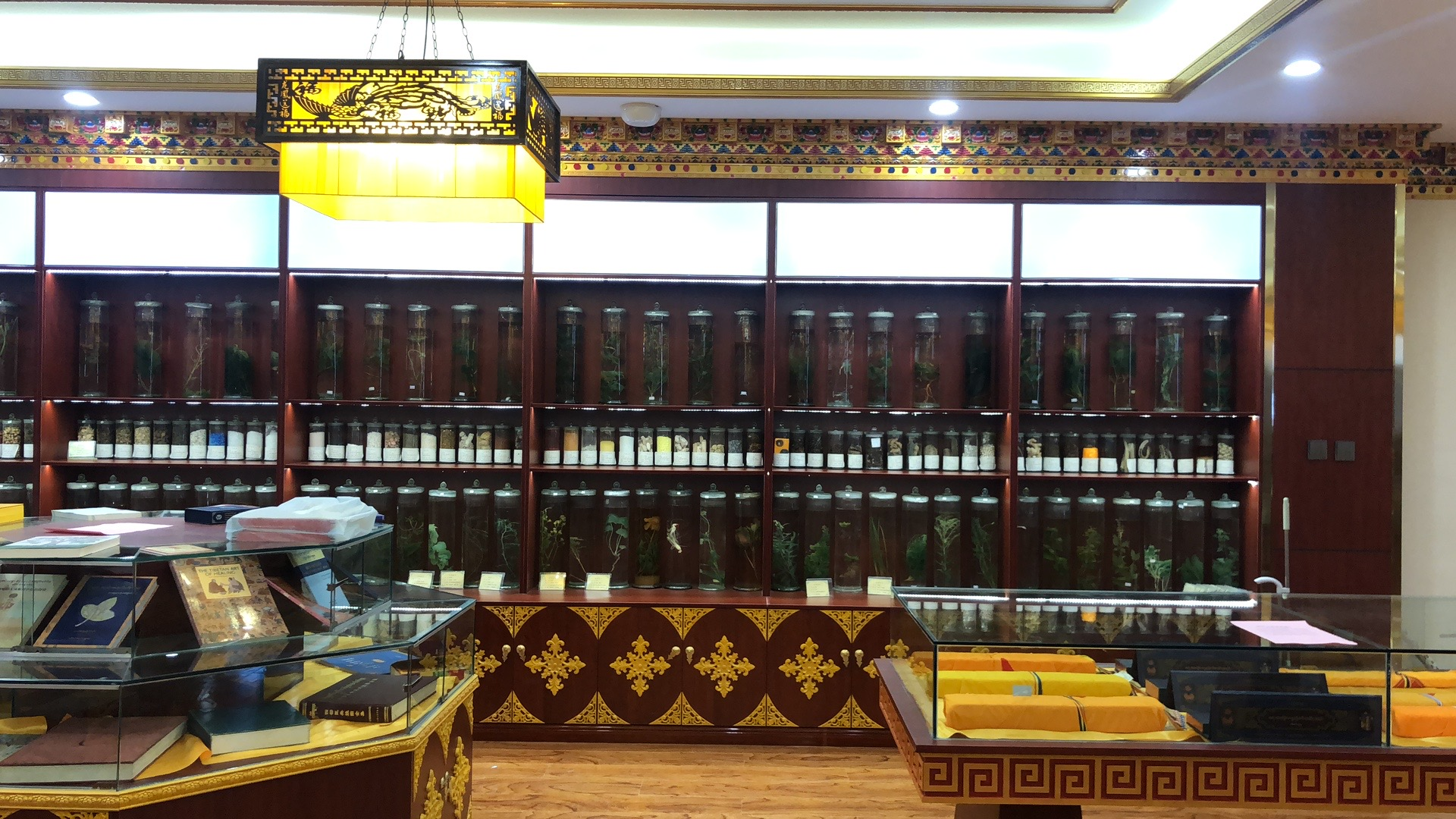 藏医史展室:通过藏医药学发展的七个历史时期的介绍,28位历代著名藏医药学家的事迹、塑像和名著,勾勒出藏医药发展的辉煌历史轨迹,图文并茂地向人们介绍了作为世界医学宝库中的一朵奇葩——藏医药悠久而灿烂的历史和丰富而博大的医药文献;同时展出藏医药文献中最具代表性的1000多函典籍, 300多部现当代藏医药学书籍和珍贵的古籍印版。通过古籍印板,《四部医典》、《月王药诊》、《祖先口述》、《四部医典蓝琉璃》、《晶珠本草》等著名典籍,显示了作为世界四大传统医学之一的藏医药学浩瀚的典籍和博大精深、体系完整的藏医药学理论。