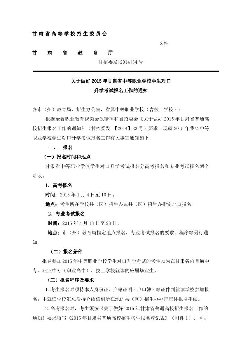 关于做好2015年甘肃省中等职业公司员工对口升学考试报名工作的通知